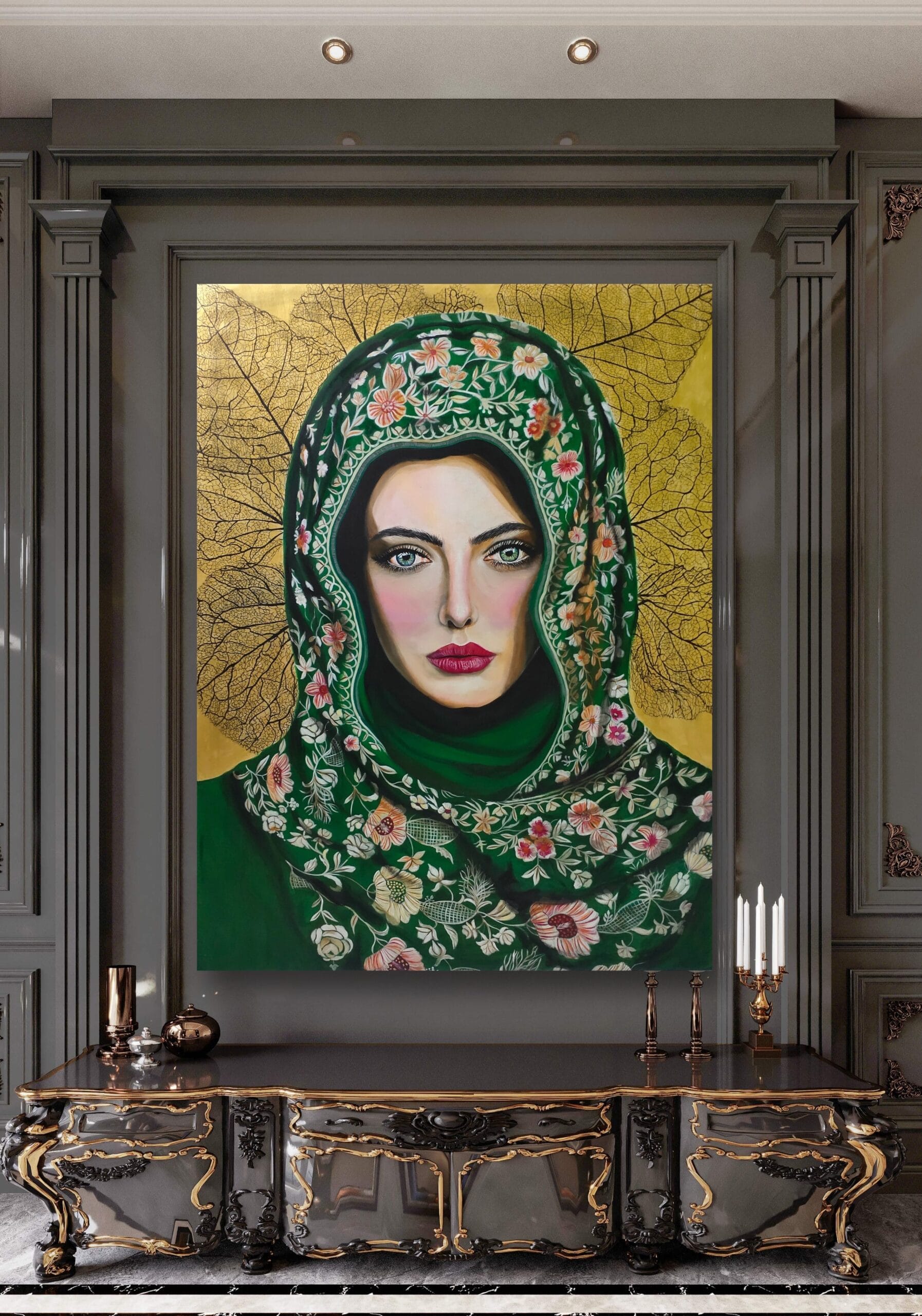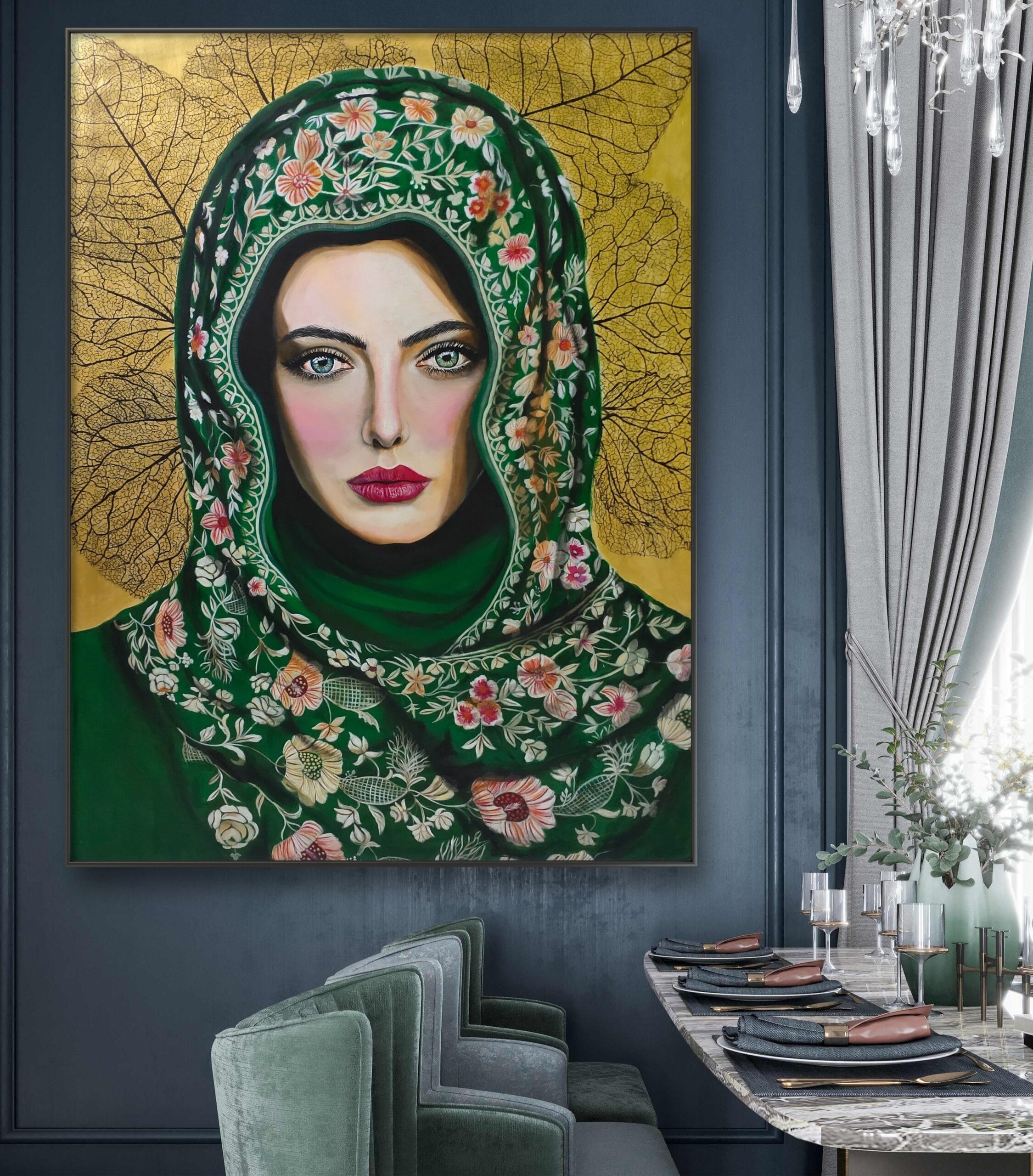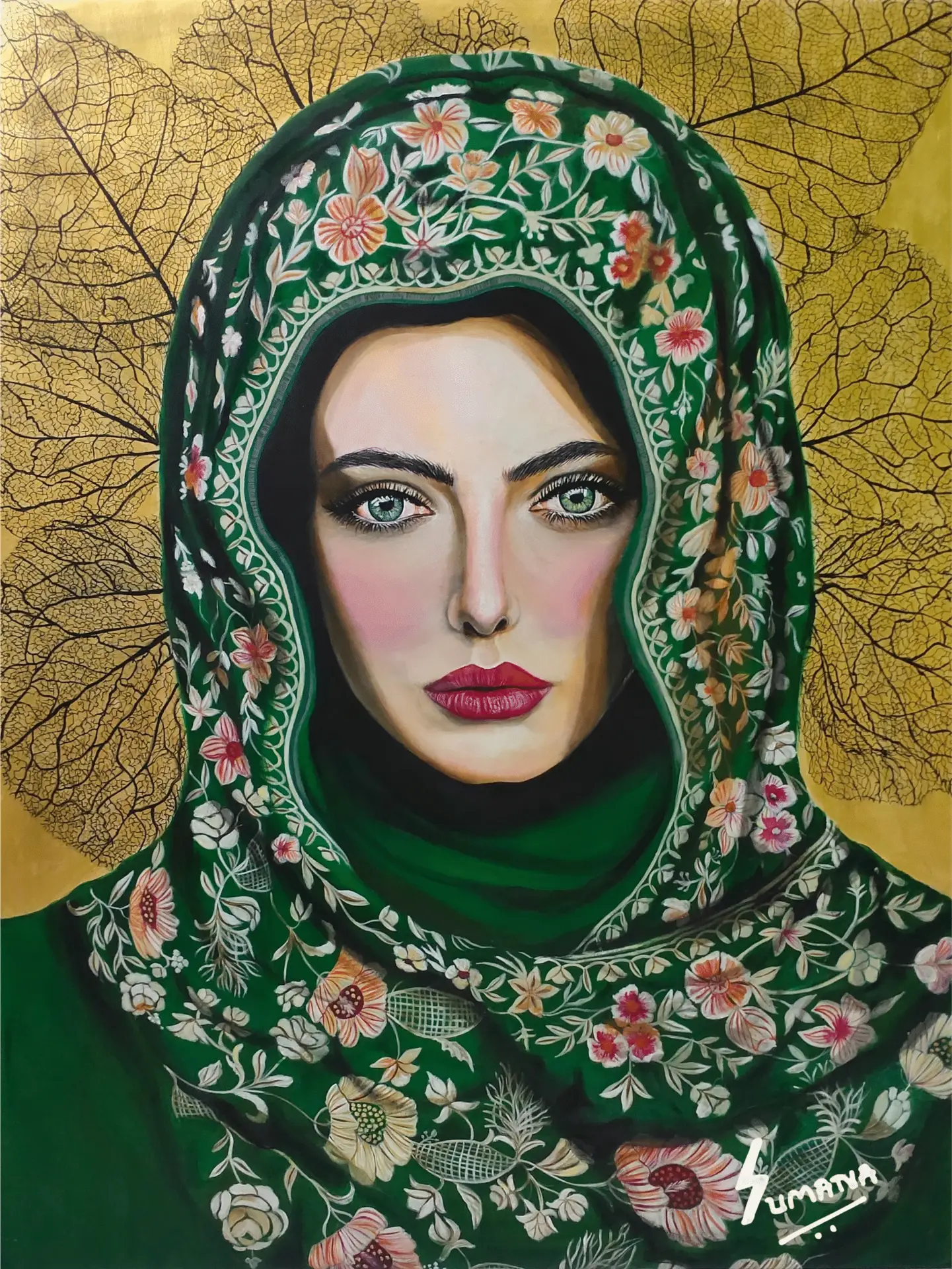 The figure’s luminous blue-green eyes draw viewers into a world of grace and mystery. Against a backdrop of high-end gold acrylic and delicate black ink skeleton leaves, the portrait glows with spiritual energy. Moreover, the floral hijab blooms with royal enigma, embodying elegance and empowerment.