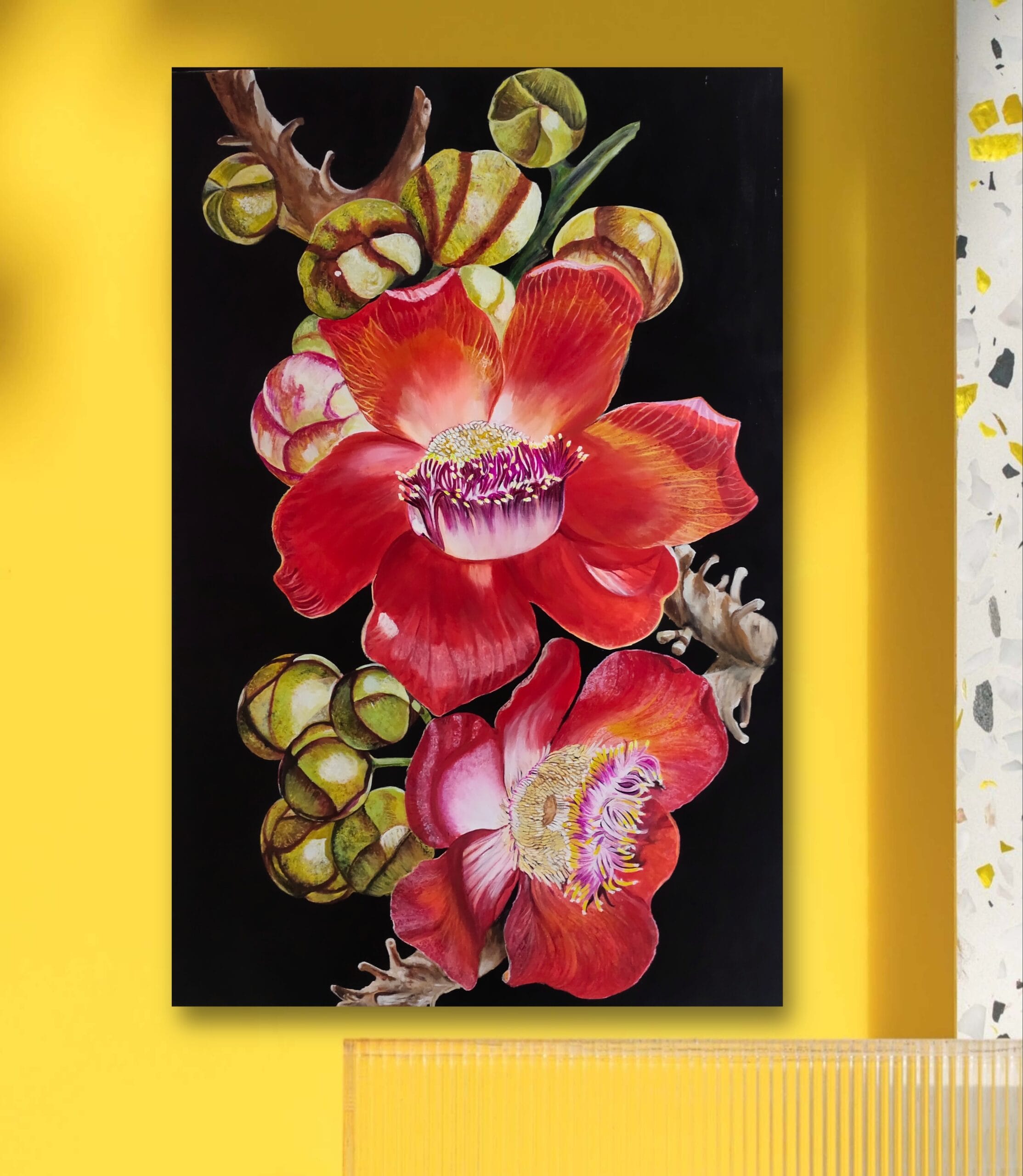 Devotees often offer the Cannonball Flower to Lord Shiva in devotion, representing spiritual surrender, reverence, and renewal. By painting them in a highly realistic yet symbolic style, Sumana has imbued this artwork with both cultural depth and universal beauty. Therefore, Divine Blooms painting radiates strength, reverence, and wonder, transforming any space into a sanctuary of natural and spiritual elegance.