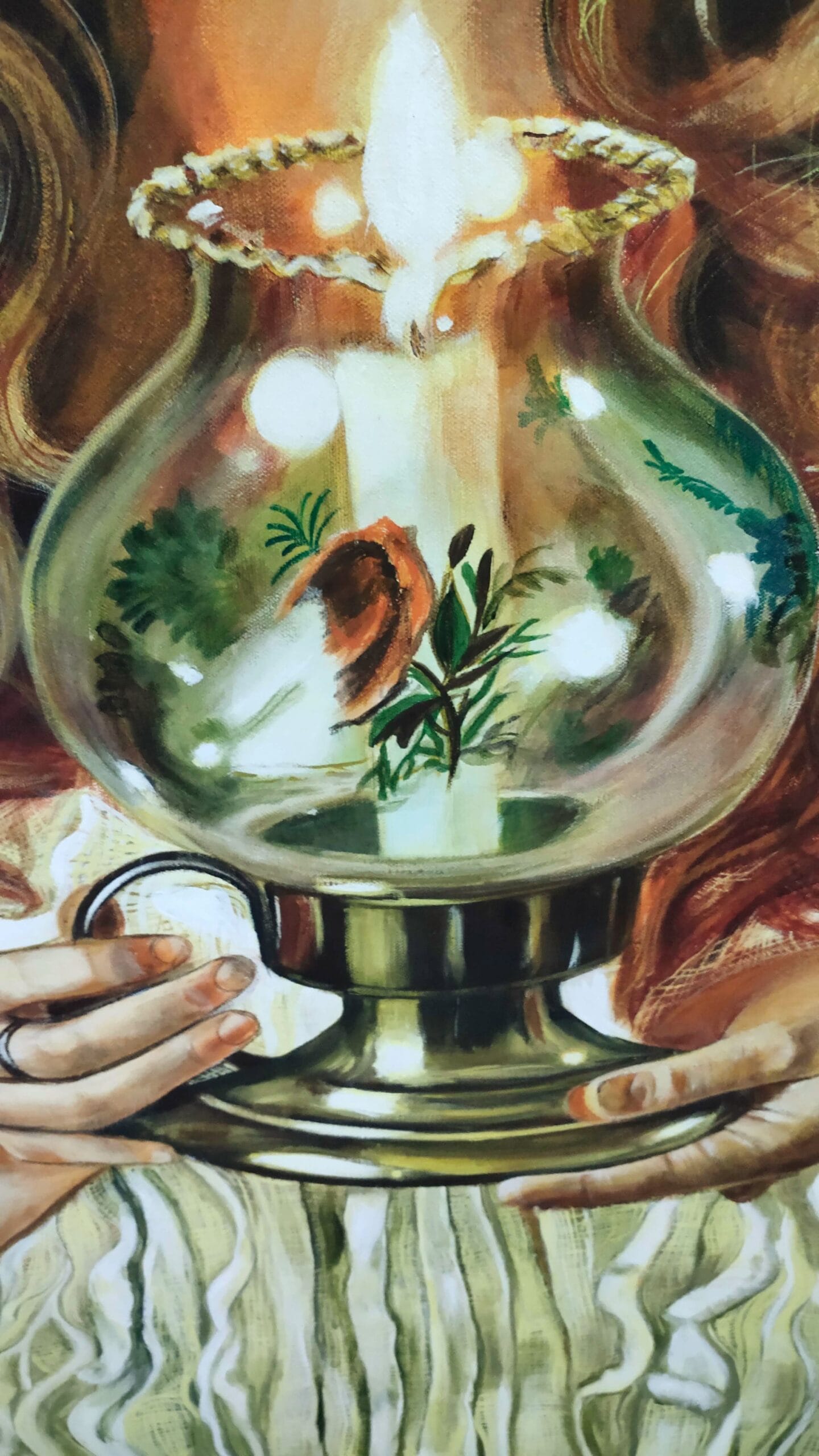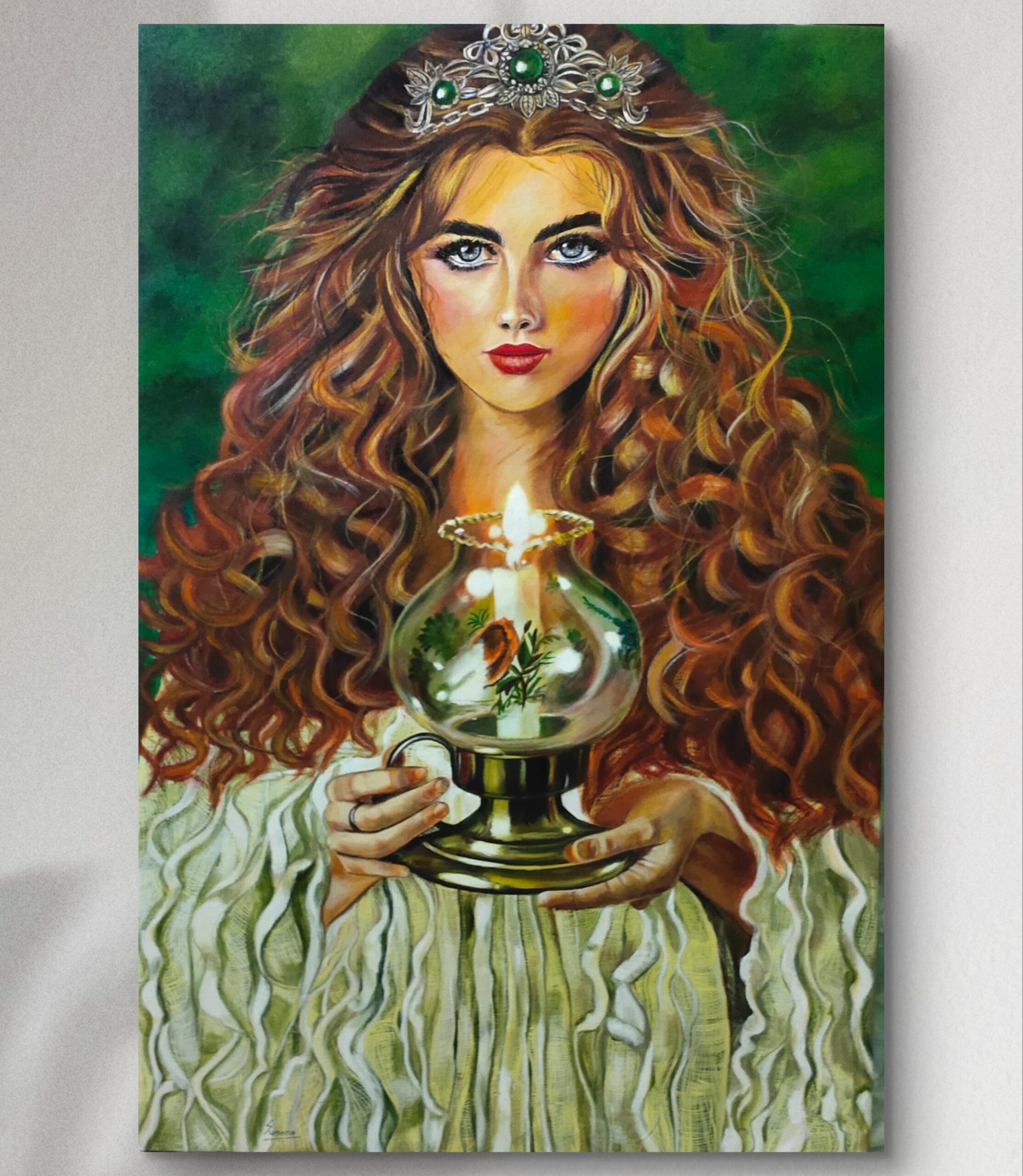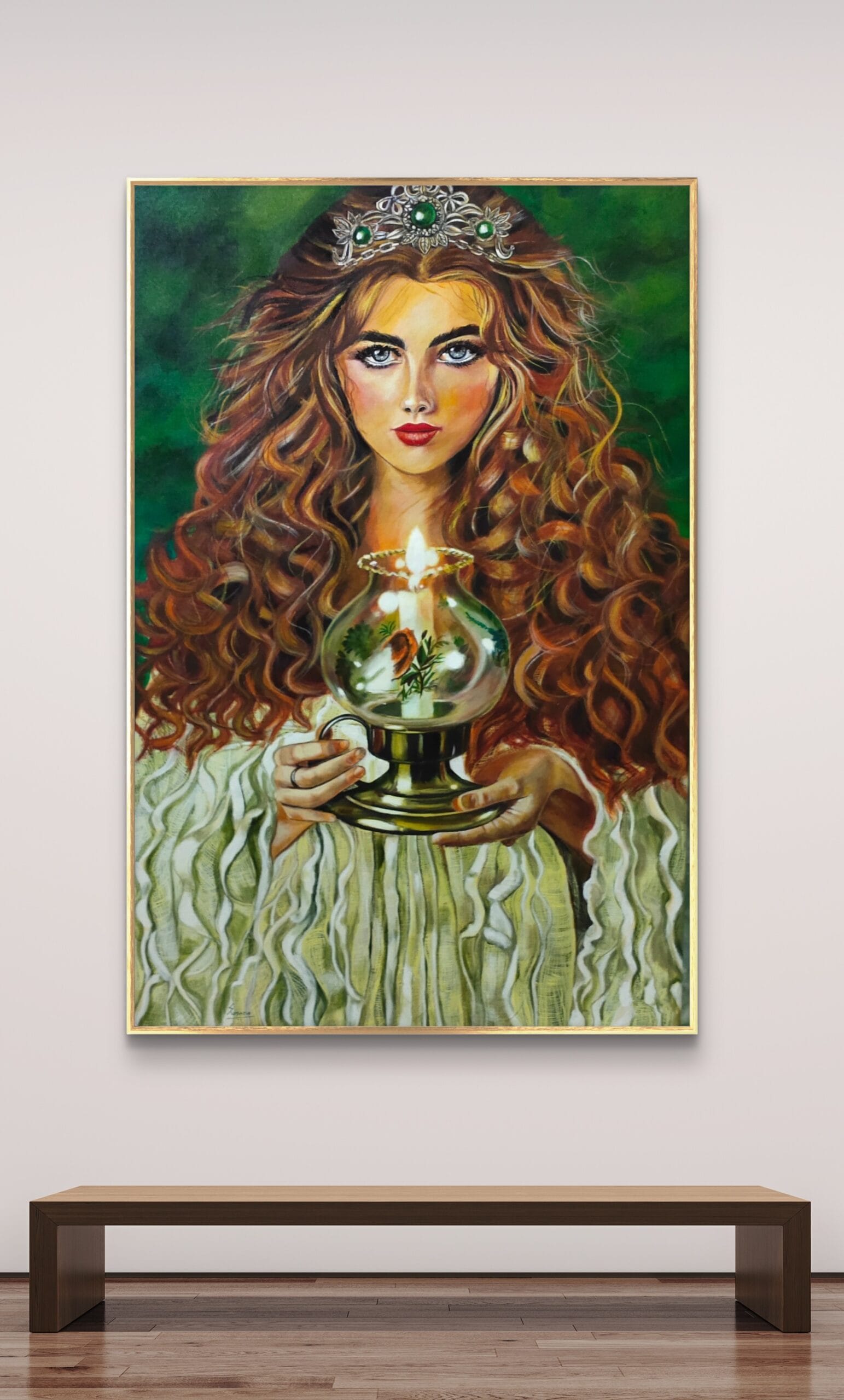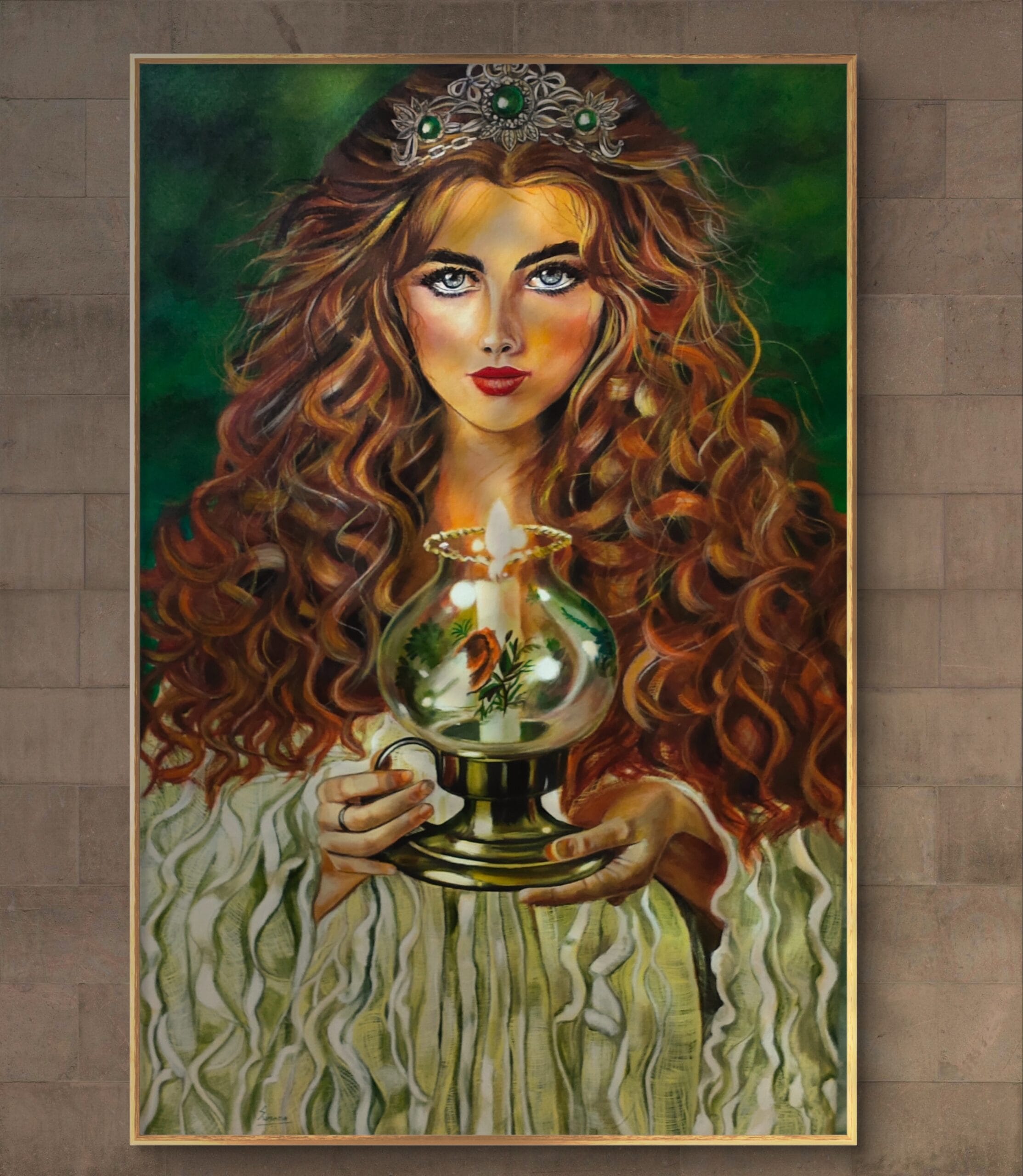 The glowing lamp represents enlightenment, guidance, and inner wisdom, while the woman embodies fierce intelligence and beauty. Moreover, the piercing eyes mirror truth-seeking, and the verdant abyss suggests renewal, abundance, and the mystery of existence. Consequently, this painting transcends portraiture, becoming an icon of the mystical feminine — an eternal flame that illuminates both darkness and consciousness.