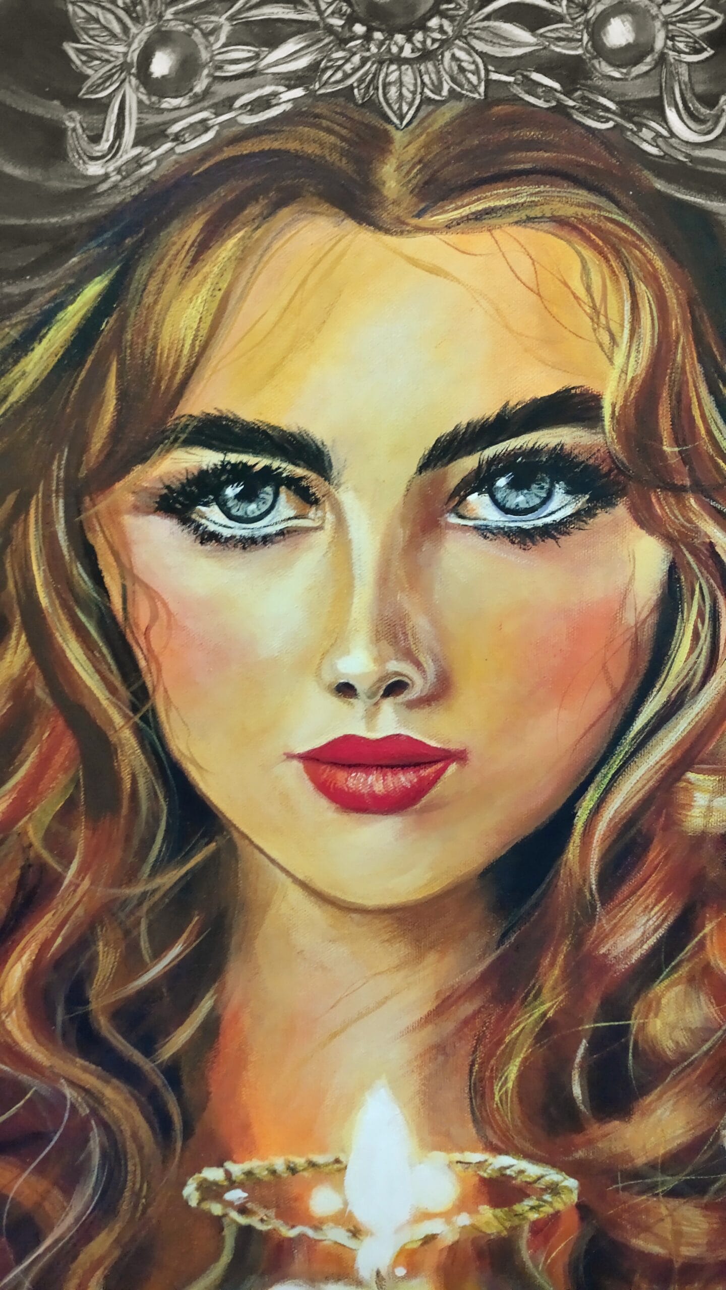 ILLUMINATI is a powerful realism acrylic portrait on canvas (30.5 × 46 inches), created by fine artist Sumana Burman. This artwork portrays the Divine Feminine as a beacon of light and wisdom. A striking woman with flowing golden hair holds a radiant oil lamp against a verdant backdrop, her piercing gaze inviting viewers into realms of self-illumination and spiritual awakening.